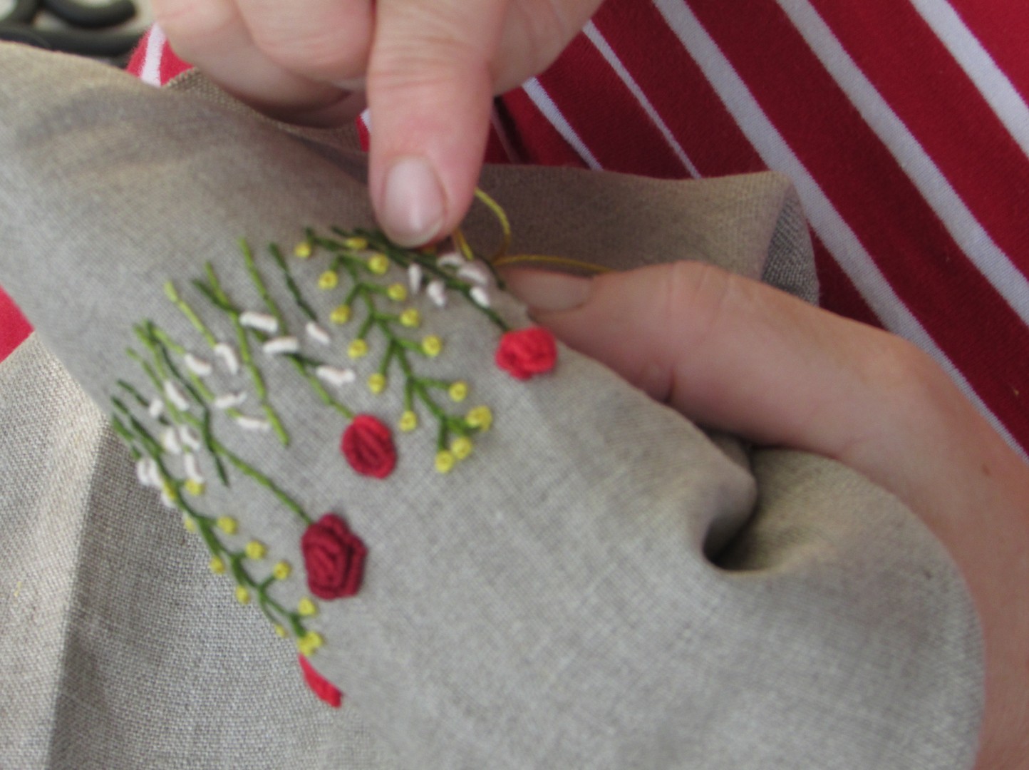 ROČNO VEZENJE je umetnost okraševanja tkanin z različnimi vrstami vbodov. Vezemo lahko na različne materiale, za naše izdelke pa uporabljamo predvsem laneno platno. Vezemo na tradicionalen način s šivanko in bombažno nitjo.